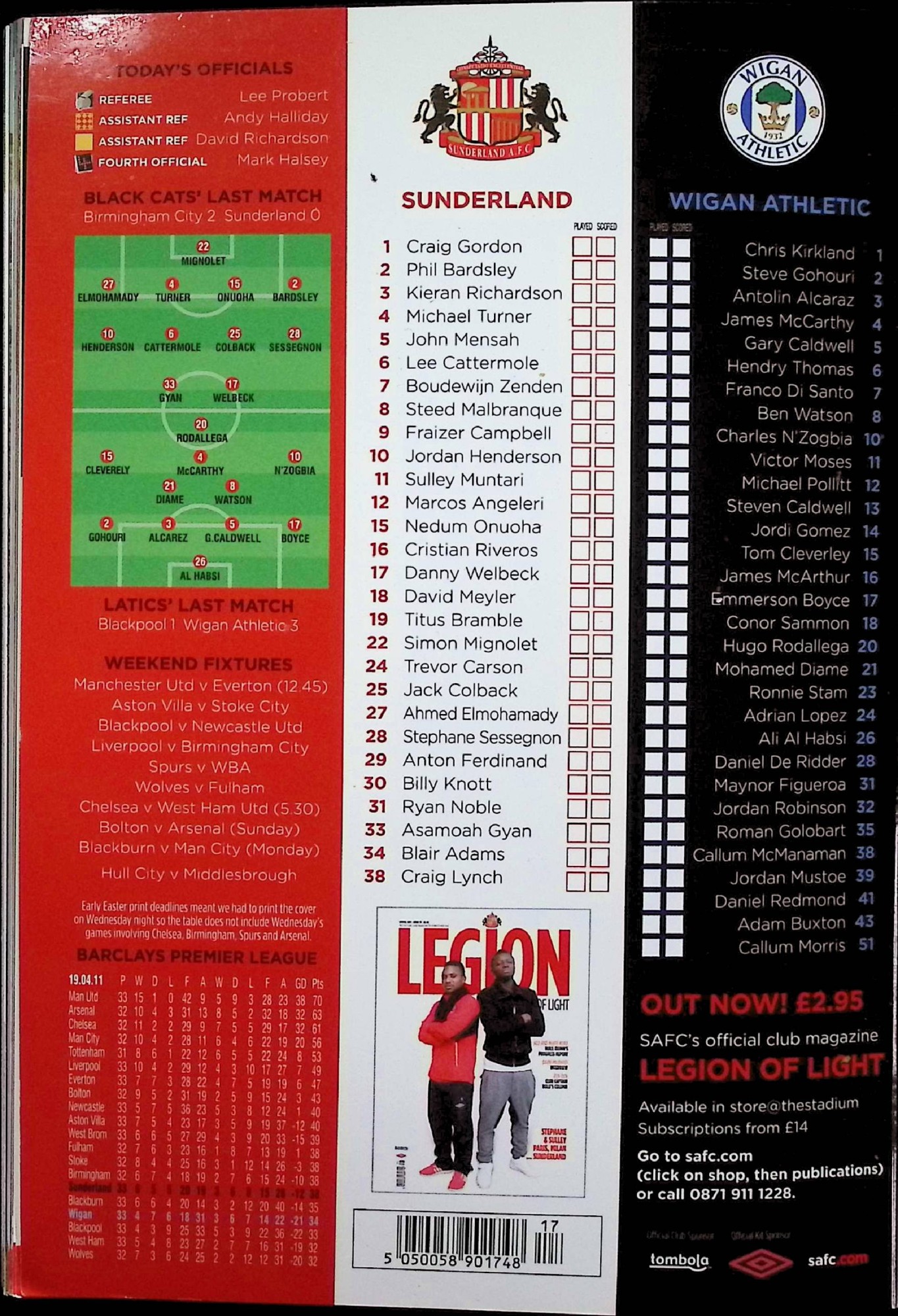 Sunderland (A) - Barclays Premier League - Saturday 23rd April 2011