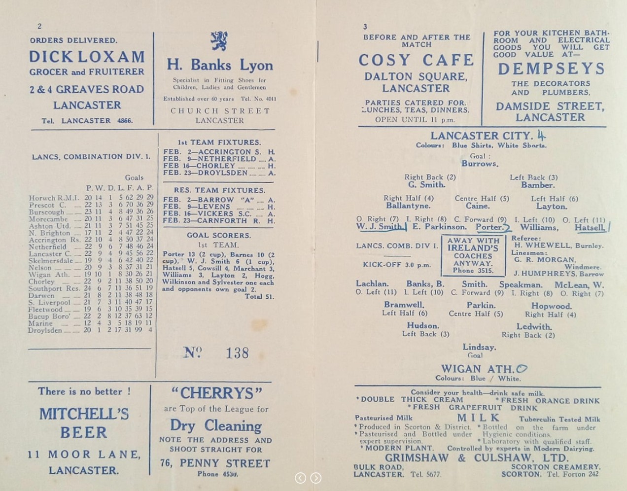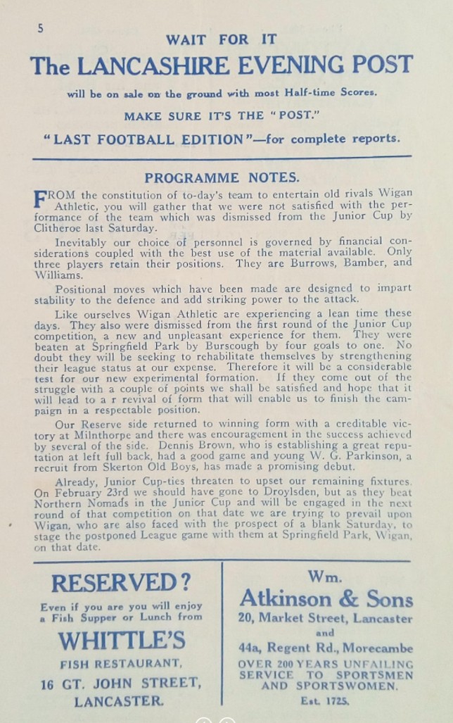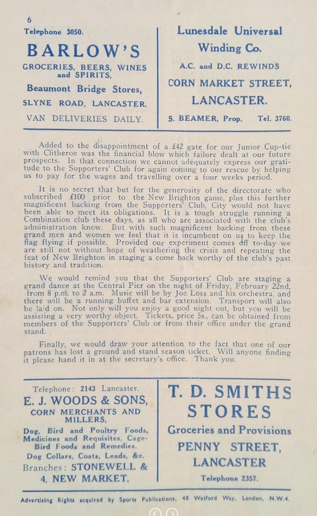 Lancaster City (A) - Lancashire Combination League Division One - Saturday 26th January 1957
